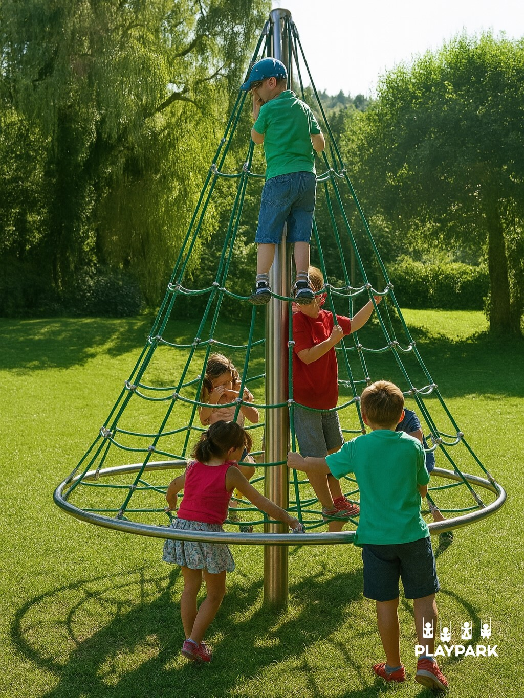 Structura de catarare DS-62 - echipament de joacă în formă de con, cu împletitură în partea inferioară din frânghii armate. Ideal pentru terenuri de joacă, curțile școlilor, parcuri și spații publice. Inaltime 2,4 metri.