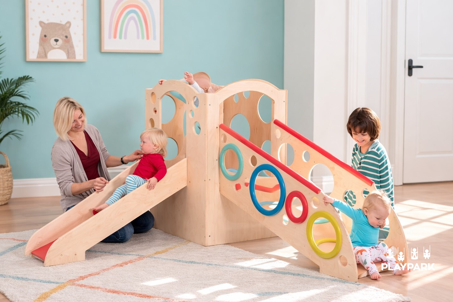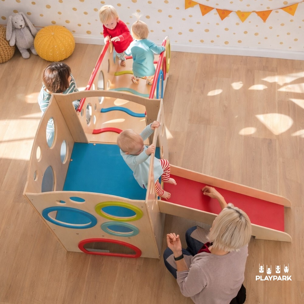 Complexul include platformă de joacă, tobogan, rampă de urcare și panouri interactive, creând un spațiu atractiv pentru mișcare, explorare și comunicare între copii.