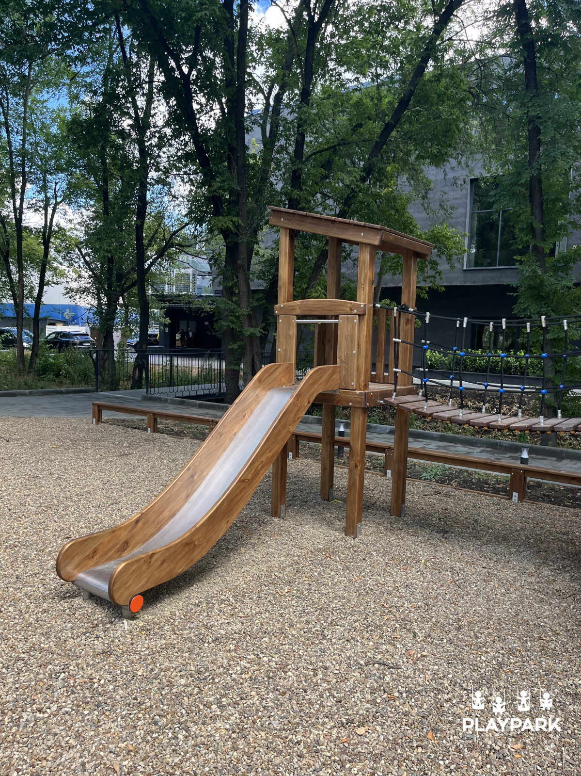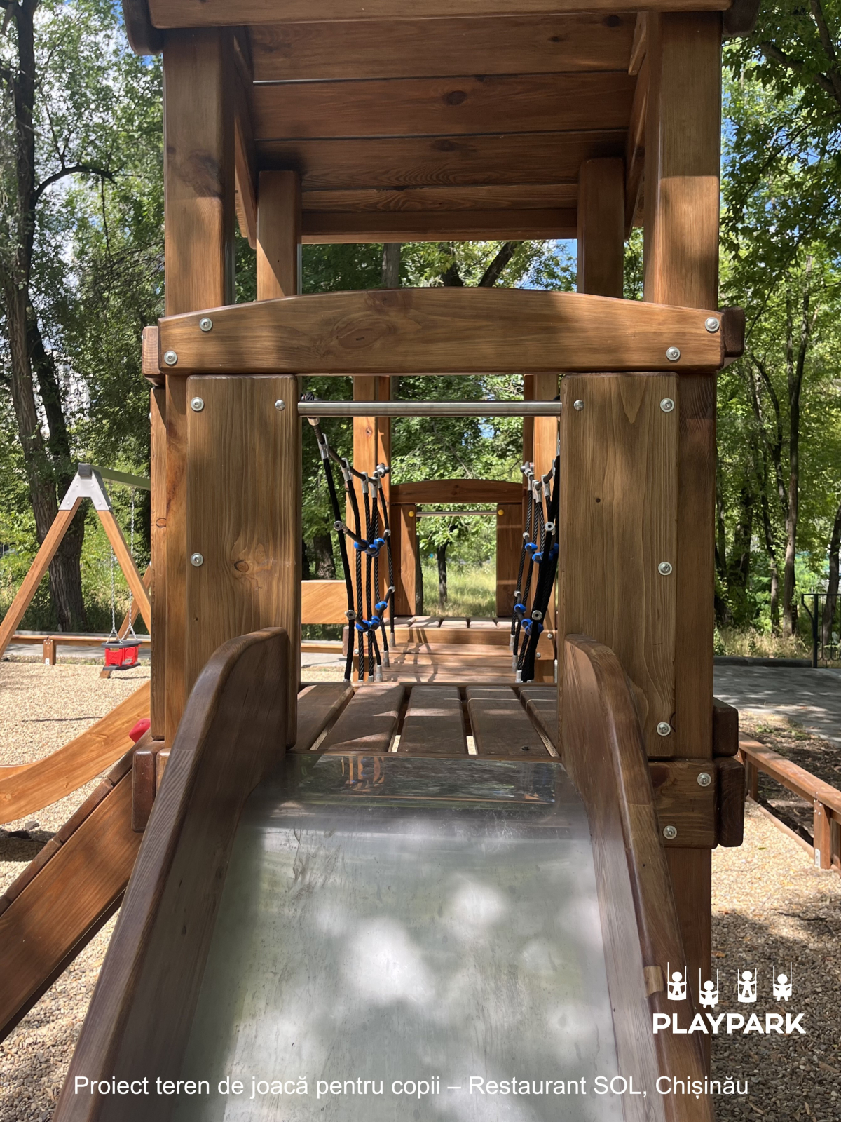Include: două turnuri, tobogan (H=1,2m), tobogan (H=0,9m), structura pentru leagăn dublu, 2 scaune certificate pentru leagăn