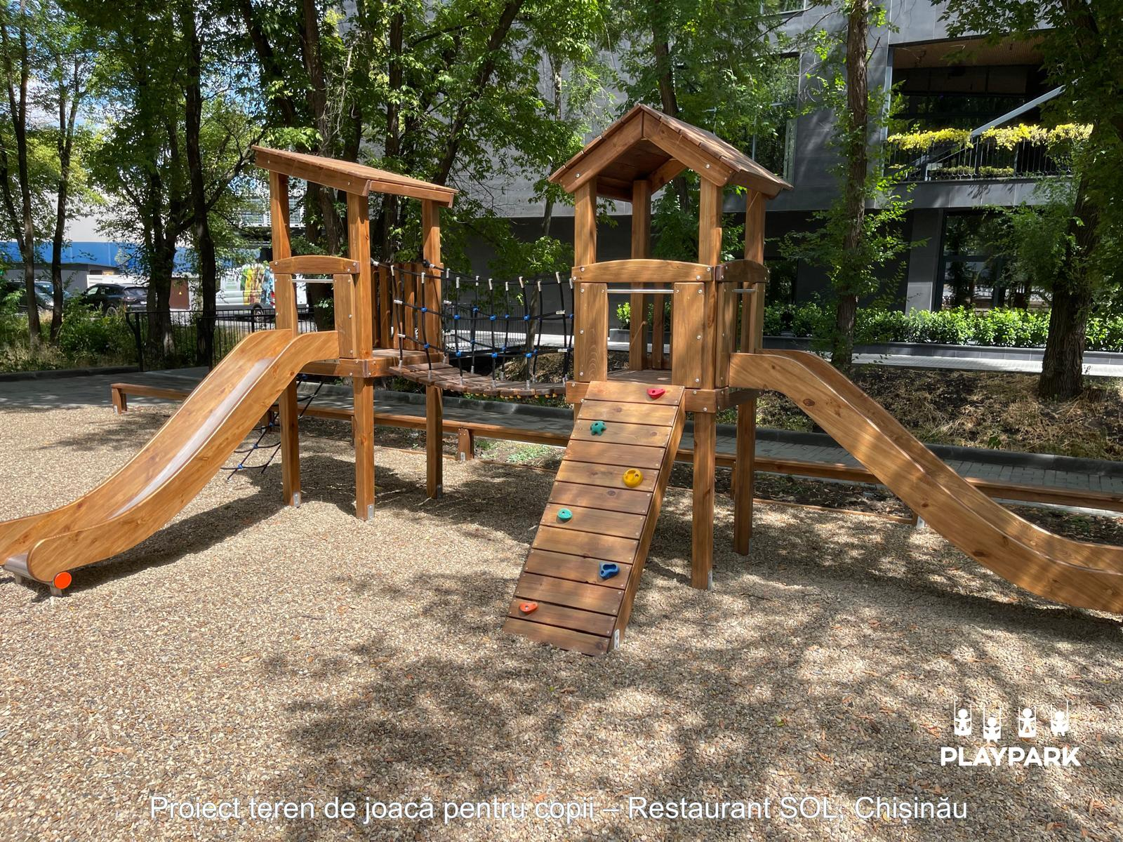 Complexul de joacă pentru copii SOL-02-6 este un echipament modern în stil Eco, realizat din lemn natural. Construcția include turnuri, leagăne duble și tobogane, creând un spațiu atractiv pentru jocul activ și dezvoltarea fizică a copiilor.