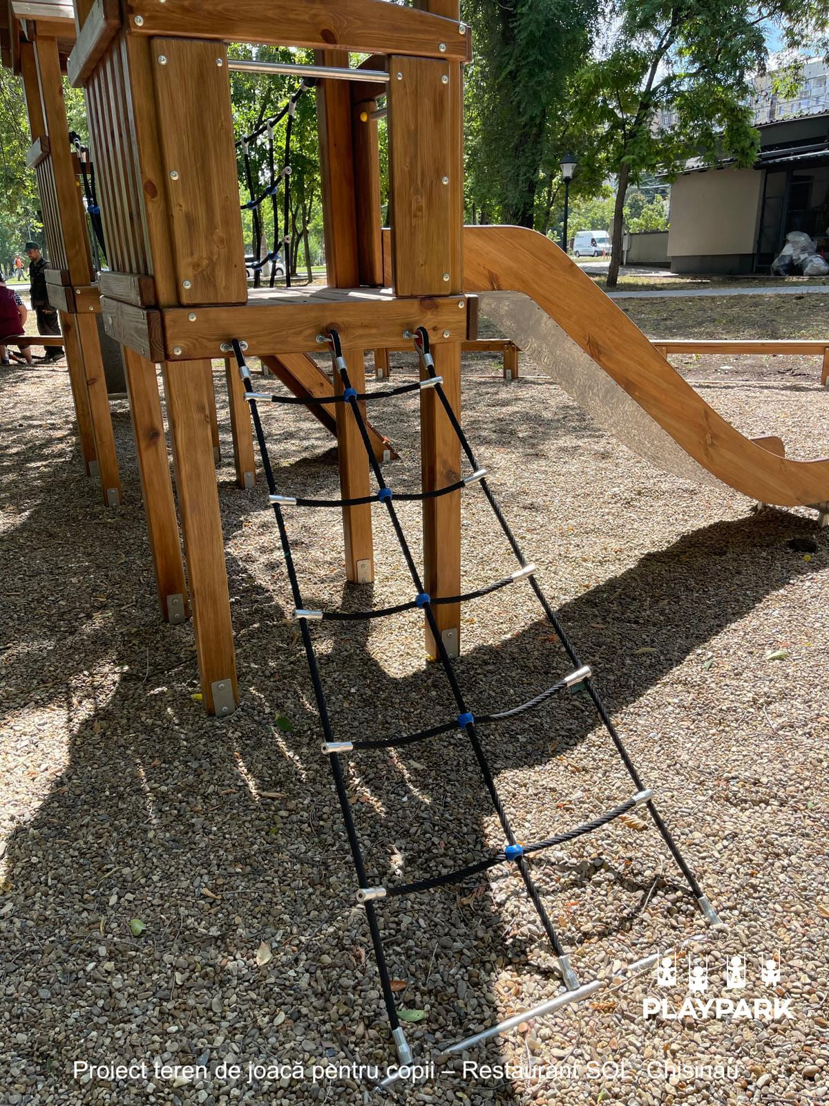 Include: două turnuri cu acoperiș, tobogan (H=1,5m), tobogan spiralat (H=1,5m), podeț, plasă de cățărare din frânghie armată, perete de cățărare, structura pentru leagăn dublu, 2 scaune certificate pentru leagăn