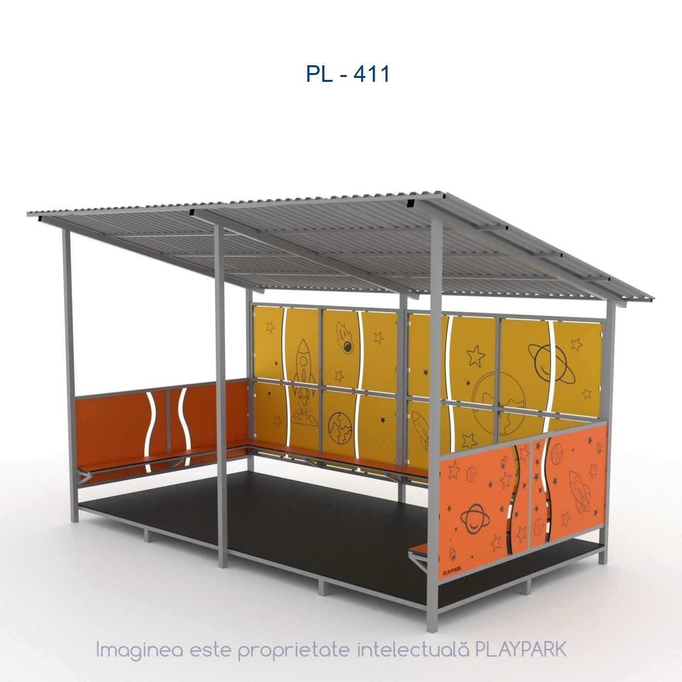 Pavilion PL- 411 (cu podea si banci) — reprezintă o soluție modernă și sigură pentru pentru spații de joacă, curți școlare, grădinițe, parcuri și zone publice. Pereții sunt decorați cu ilustrații colorate cu planete, stele și rachete, creând o atmosferă magică de aventură cosmică care inspiră imaginația copiilor. Acest design nu doar atrage atenția, ci creează și o atmosferă de călătorie cosmică plină de magie.