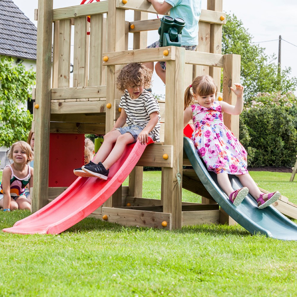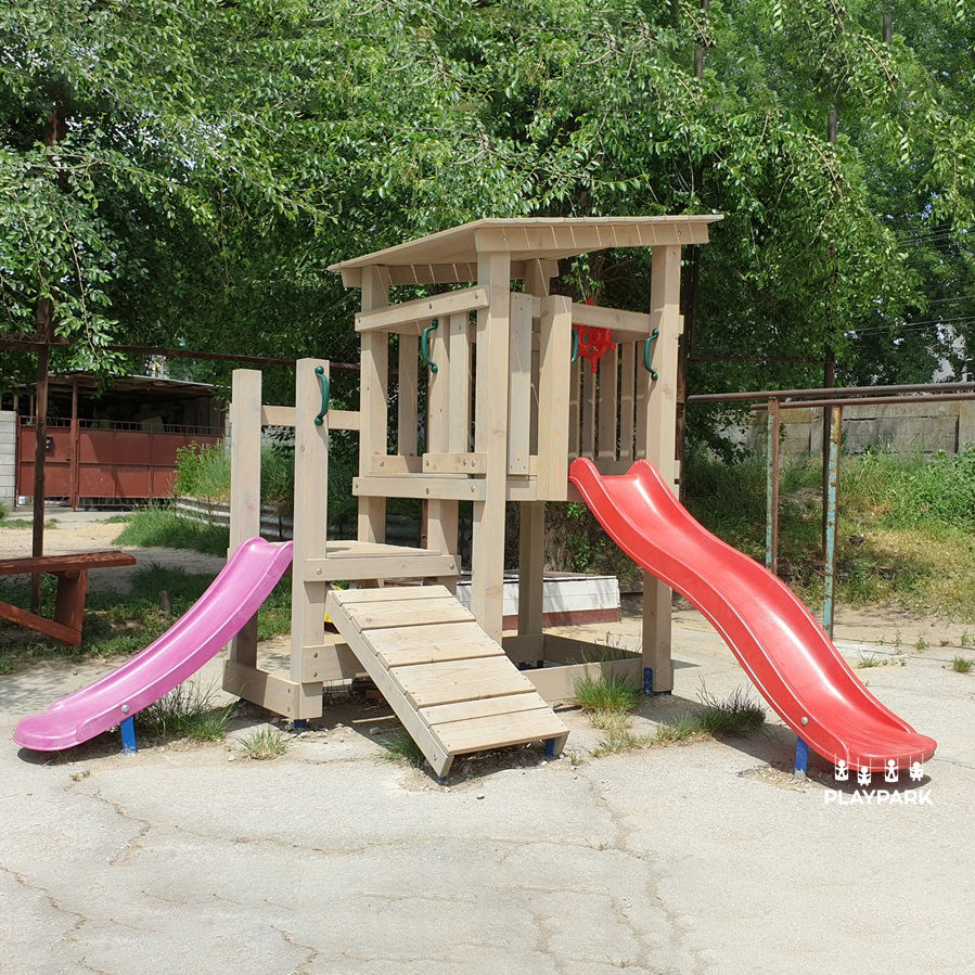 Материалы:  Конструкция выполнена из натуральной сосны (столбы 80 × 80 мм) и надёжно фиксируется к грунту анкерами. Древесина обработана защитной системой Pinotex Extreme, устойчивой к влаге, осадкам и УФ-излучению. Горка из прочного HDPE-пластика. Защитные колпачки на креплениях.  Комплектующие европейского производства.