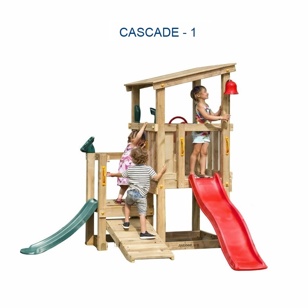 Игровой комплекс CASCADE-1 — компактная деревянная детская площадка для двора частного дома или дачи. Конструкция включает домик с крышей, балкончик, 2 горки и скалодром, обеспечивая детям полноценное пространство для активных игр на свежем воздухе. Одновременно могут играть до 6 детей.